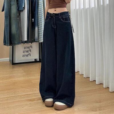 紺色のストレートジーンズの女性は腰が高くて痩せている梨型の体が股を覆ってゆったりしている