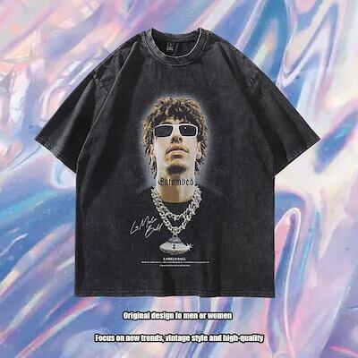 ストリート レトロ ポートレート プリント オーバーサイズ ウォッシュ加工 ダメージ加工 半袖 T シャツ メンズ レディース ヴィンテージ ハーフスリーブ