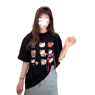 【韓国トレンド】キティプリントリボンTシャツ ラウンドネック 夏物新作レディースカジュアルトップス2色展開