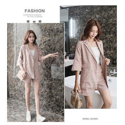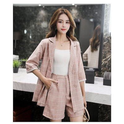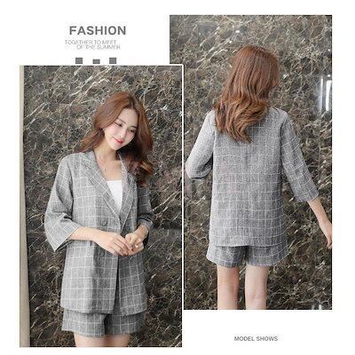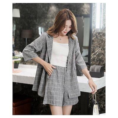 セットアップ レディース 春夏 スーツ 2点セットアップ チェック柄スーツ 七分袖スーツジャケット ショート丈パンツ 通勤 OL オシャレ 上品 2