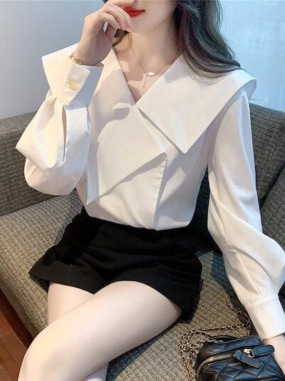今っぽシアーシャツ 2025新作 韓国ファッション春 イレギュラー ホワイト シャツ 長袖 トップス通勤 20代 30代 40代 百掛け ランタン袖
