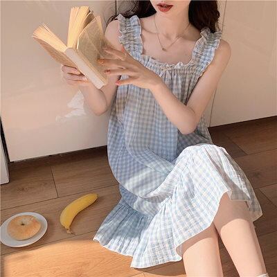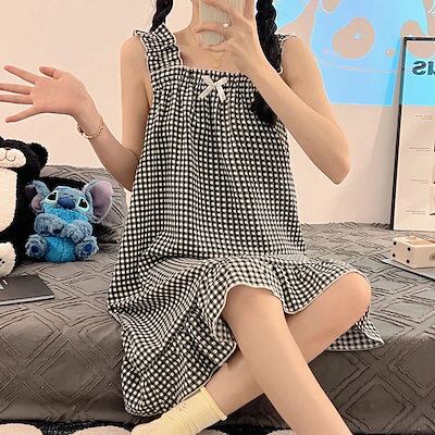 3日以内出荷の準備ノースリーブパジャマ ウェアのかわいいチェックのミディアムキャミソールスカート薄いスリーパースカートの部屋着23ワンピースレディース 韓国ファッション