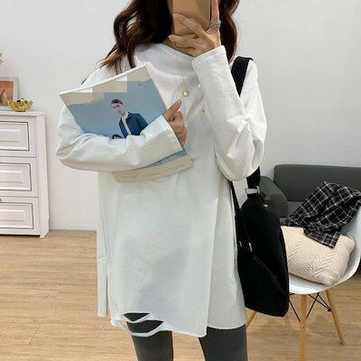 韓国ファッションTシャツ トップス長袖 ロングTシャツ 上着 ゆったりフ レディース裏起毛スリット