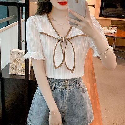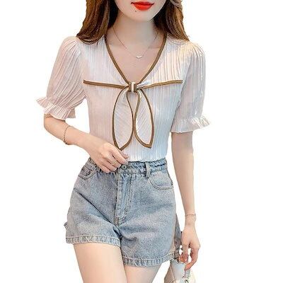 【新作登場】レディース 2024年半袖夏カジュアルバブルスリーブシフォントップス 韓国ファッション