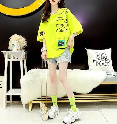 Tシャツ レディース 半袖 ロゴ 切替 ゆるい オーバーサイズ ロング トップス 7分袖 大きいサイズ クルーネック ビッグシルエット 体型カバー M L 2L 3L