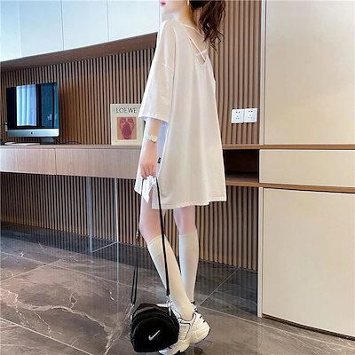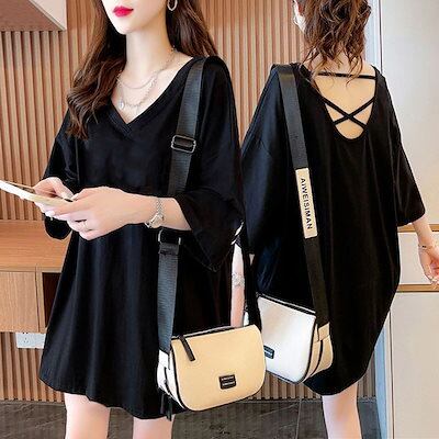 無料!夏 大きいサイズ 半袖 Tシャツ 韓国ファッション ゆったり着痩せ Vネック tシャツ レディース 体型カバー ロングTシャツ スウェット無地 半袖tシャツ夏服スウェット