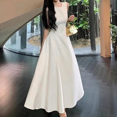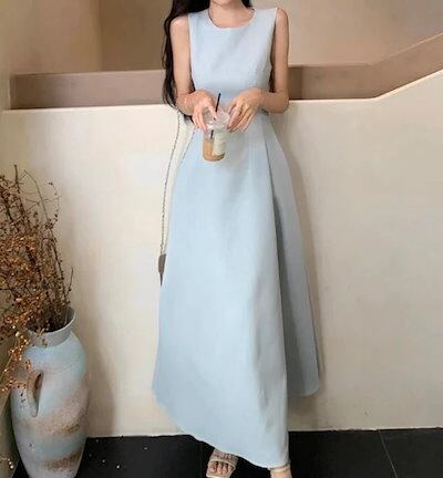25 ワンピース ドレス ロング丈 ラウンドネック ノースリーブ 細見え 脚長効果 黒 水色 おしゃれ かわいい カジュアル 韓国ファッション レディース お出かけ