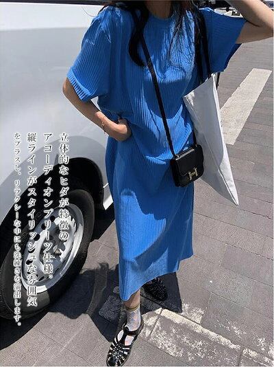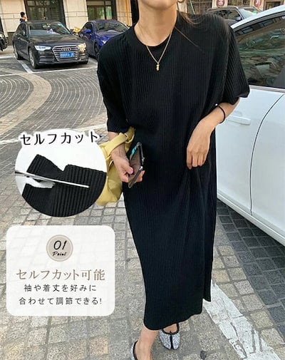 レディース 夏 半袖 きれいめ クルーネック 裾カットOK マキシ丈 オフ 半袖 ワンピース Tシャツワンピース ワンピース ビッグシルエット ロング ロングワンピース プリーツワンピース プリーツ