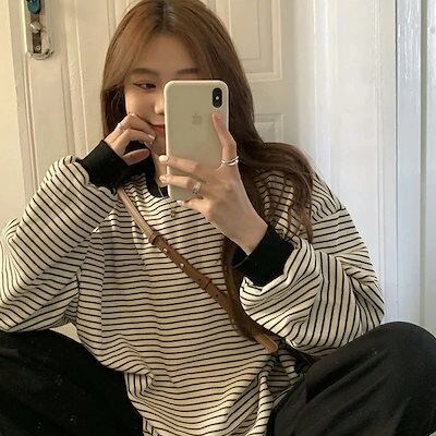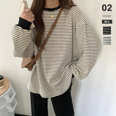 ロングtシャツ 長袖 体型カバー レディース トップス クルーネック オーバーサイズ tシャツ 大きいサイズ 【即日発送】ボーダー カットソー ロンt ボーダーtシャツ 大きめ ロング丈 ドルマンスリ