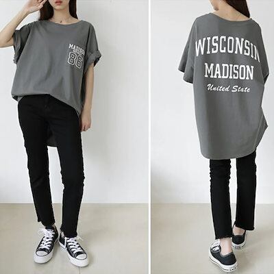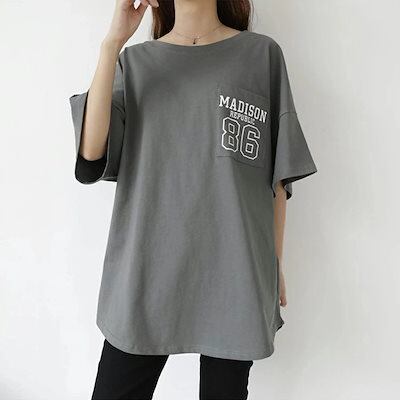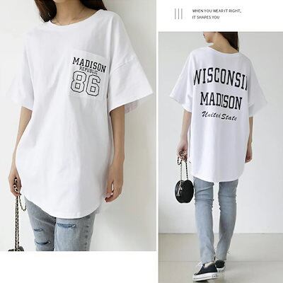 半袖シャツ カットソー ロゴプリント ロゴ オーバーサイズ トップス ロゴプリント レディース 大きいサイズ ロング 半袖 コットン 体型カバー ポケット ロンt 綿 tops 【即日発送】tシャツ