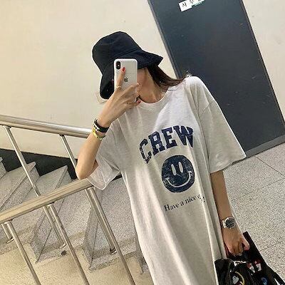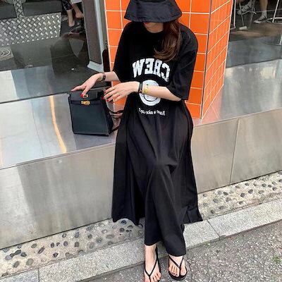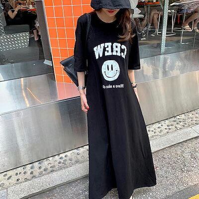 半袖 体型カバー プリント 韓国 きれいめ 大きいサイズ Tシャツ レディース カレッジアソート ワンピース 着痩せ 大人 カジュアル ロング丈 春 着回し 夏 ゆったり 【即日発送】フレアワンピース