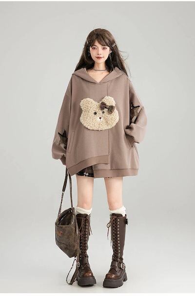 本日の限定商品かわいい毛皮のクマの装飾された緩いフード付きのトレーナー 2024 新デザインコート スウェット スエット ロンT ロングTシャツ ロンティー トレーナー 長袖tシャツ レディース tシ