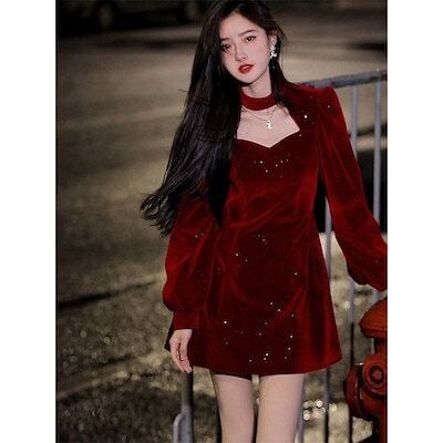 春 レディースファッション 赤い ワンピース ドレス お呼ばれ
