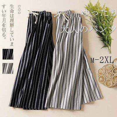 パンツ レディース ワイドパンツ ストライプ ガウチョパンツ 春 きれいめ ロングパンツ ハイウエスト 綿麻 パンツ リネン ボトムス 体型カバー ウエストゴム ストライプ柄 ナチュラル ラックス カ