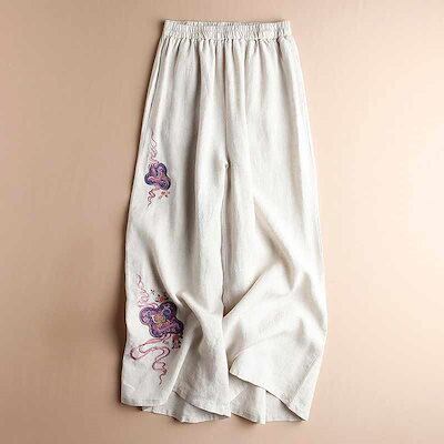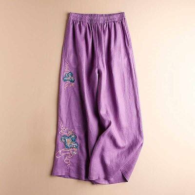 ワイドパンツ レディース パンツ 綿麻 リネン ガウチョパンツ 春夏 リネンパンツ パンツ ハイウエスト きれいめ ボトムス 刺繍 花柄 スカーチョ ガウチョ リネン 大きいサイズ ロングパンツ ゆっ