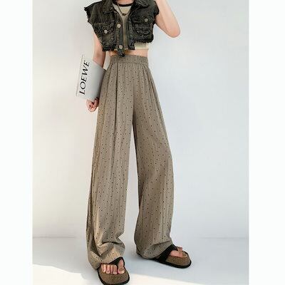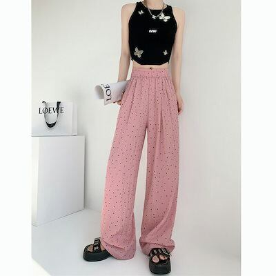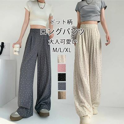 ワイドパンツ ワイド ドット柄 ストレートパンツ 大きいサイズ レディース ガウチョパンツ 春 夏 ウエストゴム ハイウエスト ポケット付き ロング丈 ロングパンツ ゆったり ドット柄パンツ オフィス