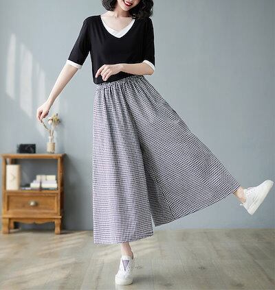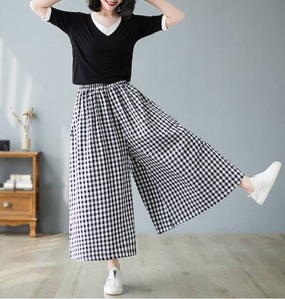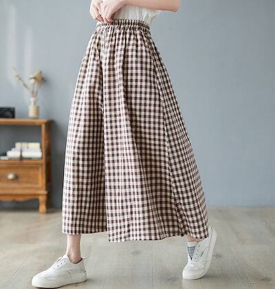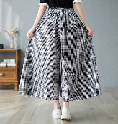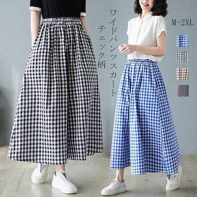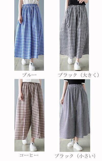 チェックパンツ レディース 綿 麻 パンツスカート 春 夏 9分丈 ウエストゴム パンツ ポケット付き ハイウエスト ゆったり オフィス ボトムス ワイド 無地 リネンパンツ カジュアル きれいめ ガ