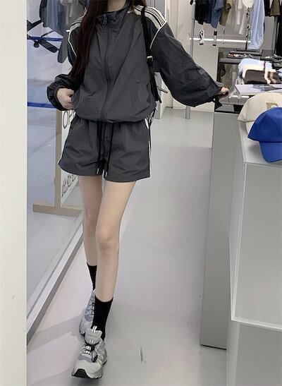 2024 春夏セットアップ トップス 長袖 ジャージ ジップ チャック ショートパンツ 春 ゆったり グレー 韓国ファッション レディース お出かけ
