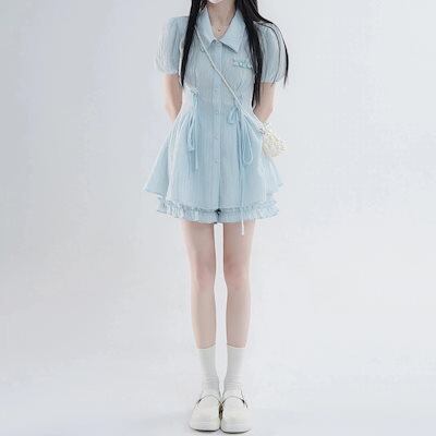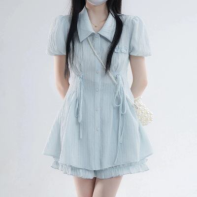 【2点セット 】2025新作 セットアップ レディース 夏 ブルーサマースーツ甘め半袖トップスショートパンツ
