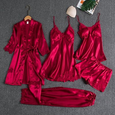 胸パッド付き ルームウェア 5点セット レディース サテン パジャマ トップス キャミソール ショートパンツ パンツ ガウン セット レース 刺繍 秋冬 寝巻き 部屋 福袋
