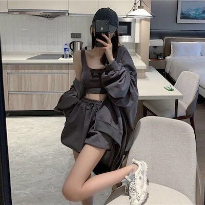 涼しく楽ちんセットアップ スポーツスーツ2024サマーパーカー+タンクトップ+ショートパンツの3点セット レディース 韓国ファッション