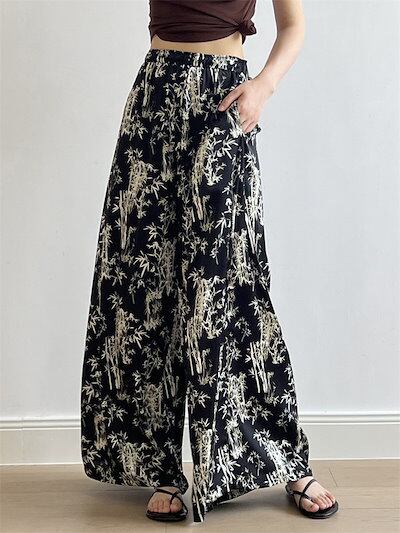 ワイドパンツ ひんやり 竹柄パンツ レディース 夏 フレアパンツ 涼しい ガウチョパンツ ロングパンツ リゾート 花柄 バギーパンツ 大きいサイズ ゆったり シフォン リラックス ビーチ 海 爽やか