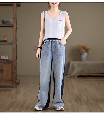ワイドデニムパンツ 切替 ワイドパンツ レディース スウェット パンツ 春秋 ロングパンツ デニムパンツ ジーンズ ボトムス リラックス ウエストゴム ジーパン バギーパンツ イージーパンツ ゆった