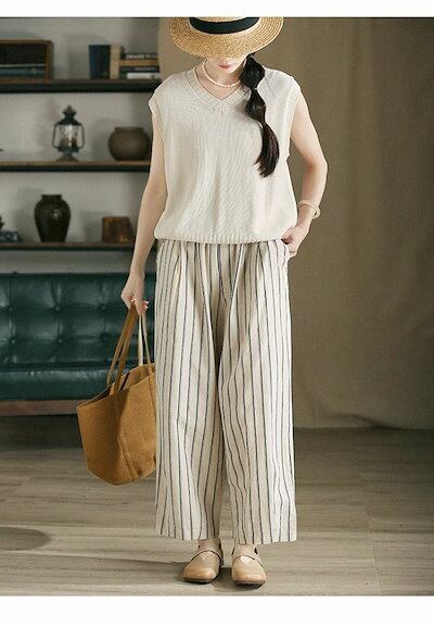 パンツ レディース ワイドパンツ ボトムス ストライプ 綿麻風パンツ イージーパンツ バギーパンツ テーパードパンツ 春 夏 秋 九分丈 大きいサイズ ゆったり 体型カバー 大人可愛い 森ガール キレ