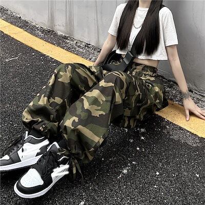 新作 韓国 カーゴパンツ レディース 人気 ワイド 迷彩 カーゴパンツ ダボかわ ストリート メンズライク ワイルド カジュアル 裾ドローコード バギーパンツ 古着っぽ ワークパンツ