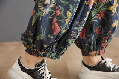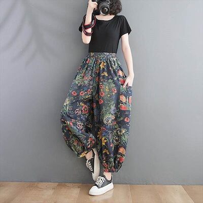 バギーパンツ デニム ワイドパンツ サルエルパンツ レディース 花柄 フローラル ボタニカル フラワー 総柄 レトロ カジュアル 個性的 ダボダボ ゆる ズボン ボトムス 裾絞り ジーンズ ジーパン