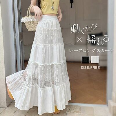 フレアスカート レディース 春 夏 スカート ロング丈 切り替え レース 刺繍 ウエストゴム ボトムス 異素材 ロングスカート 透け感 裏地付き マキシ丈 薄手 ふんわり ボリューム セレモニ