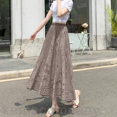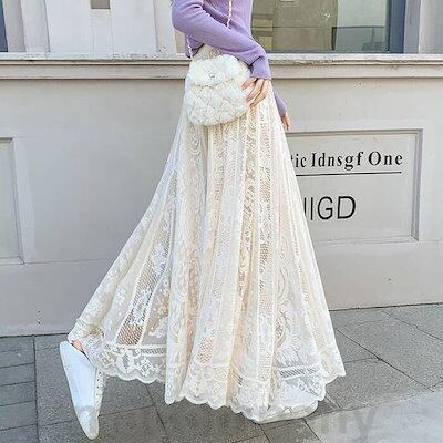 スカート ボトムス レース エレガント レディース きれいめ カジュアル おしゃれ ロング丈 大人 可愛い フェミニン Aライン 体型カバー ウエストゴム ナチュラル ベージュ パープル ブラウン ホ