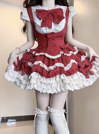 ロリータ 二次元 メイド服 ロリータかわいい少女リボンシャツストラップスカート2点セット学院祭用 二次元服 ロリスーツ コスプレ 韓国ファッション