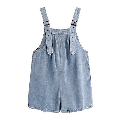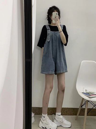 コーデ完成!サロペット 時短コーデ イチオシオールインワン 韓国ファッション ロールデニムバックパンツショートパンツ女性夏新作小さいワイド脚学生ルーズジャンプスーツ