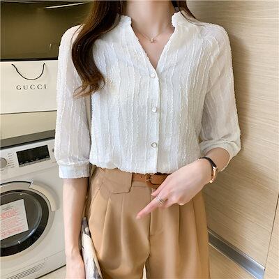 今っぽシアーシャツ 夏先取りブラウス 半袖シャツ女性2024夏通勤シフォンVネックブラウスTシャツデザインルーズソリッドカラートップス 韓国ファッション