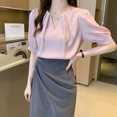 【3日内出荷】今っぽシアーシャツ 夏先取りブラウス 半袖シフォンシャツレディース2024夏韓国版シャツシャツスモールシャツファッションパールVネック薄手カジュアルブラウス 韓国ファッション