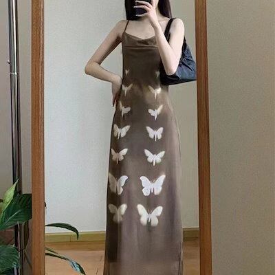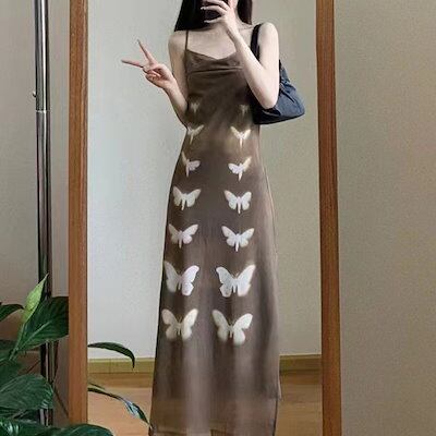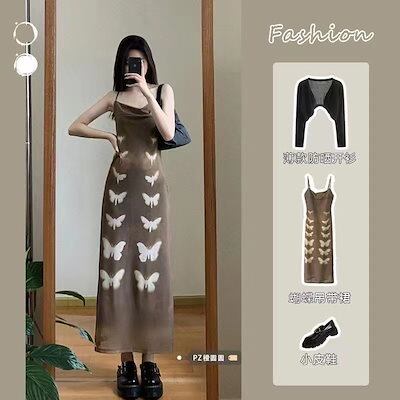 キャミワンピース パーティードレス ヴィンテージ蝶プリントキャミソールワンピースセット女性夏の日焼け止めニットカーディガン+セクシーウエストロングスカート 韓国ファッション