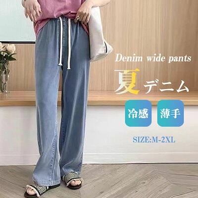デニムパンツ レディース ワイドパンツ ウエストゴム デニム 接触冷感 春 夏 ひんやり UVカット 無地 薄手 涼しい ロング丈 ストレートパンツ ジーンズ 体型カバー ボトムス ズボン ゆったり