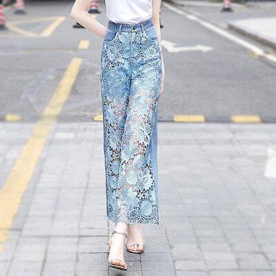 デニムボトムス 秋 デニムパンツ ハイウエスト ワイドパンツ レディース 夏 デニム ズボン 透かし彫りレース 設計 ジーンズ ゆったり ストレート デニム パンツ ひんやりボトムス
