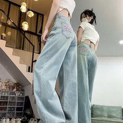 蝶結び刺繍ストレートジーンズ女性秋水洗いブルーハイウエストゆるいワイドパンツ痩せ地ズボン