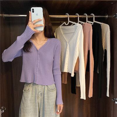春秋 修身 レトロ ニット Vネック カーディガン セーター 女式 ショットタイプ 長袖ブラウス トップス インナー