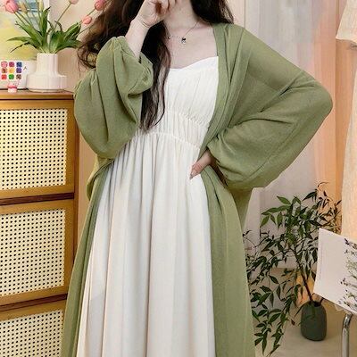 一部即納 夏秋 新作 セットアップ セミロング キャミソールワンピース + シフォンブラウス カーディガンキャミワンピース シャツ アウター 二点セット