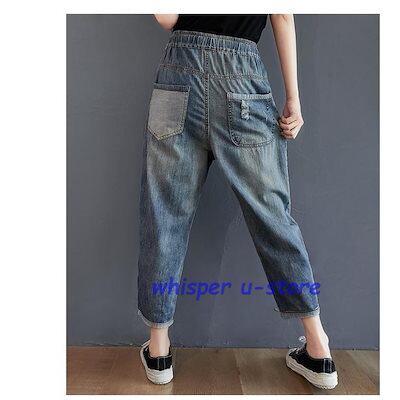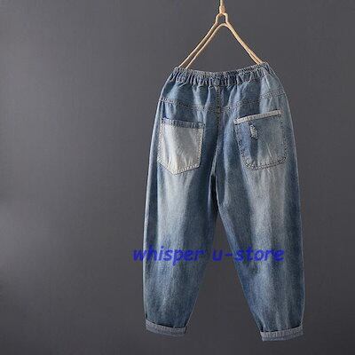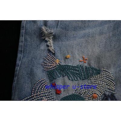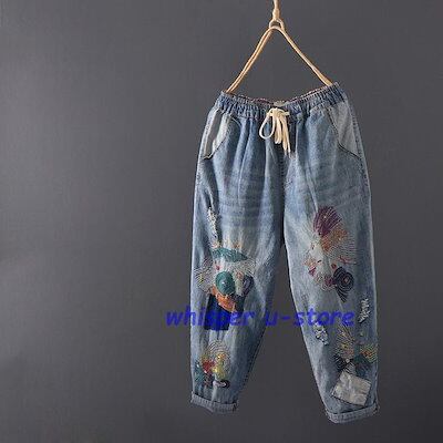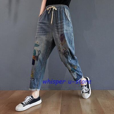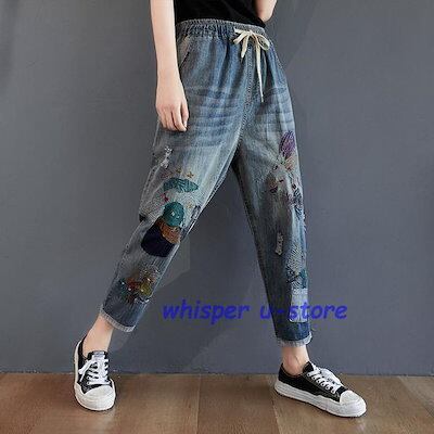 ジーンズ レディース アンクル丈 刺繍 おしゃれ イージーパンツ 八分丈 デニムパンツ ウォッシュ ダメージ