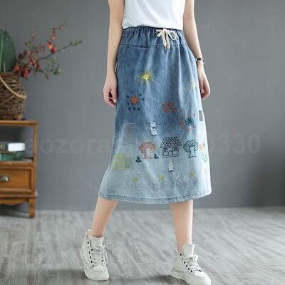 スカート レディース グラデーション 刺繍 ウォッシュ ダメージ デニムスカート ミモレ丈スカート アンクル丈 Aライン