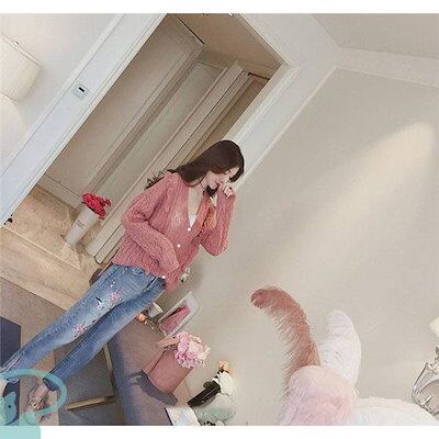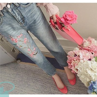 デニムパンツ レディース スキニー 刺繍 花柄 スリット ボ ジーンズ ストレッチ 伸びる 細身 アンクル丈 美脚 カジュアル スリム 薄手 秋