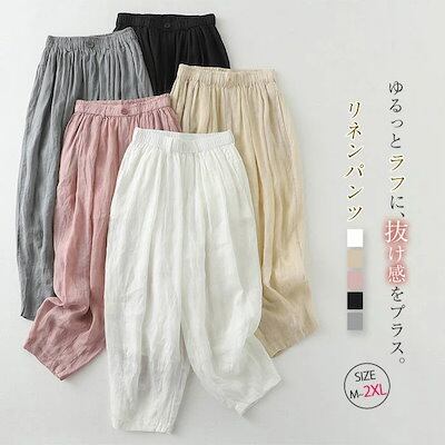 リネンパンツ レディース サルエルパンツ 麻パンツ ロングパンツ ワイドパンツ 春 夏 綿麻 ハロンパンツ イージーパンツ タックパンツ 九分丈 ロング ボトムス ウエストゴム 美脚 通勤 カジュアル