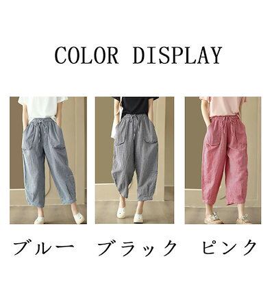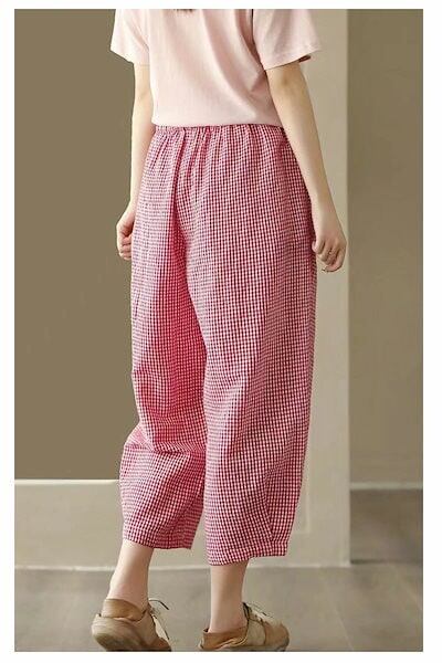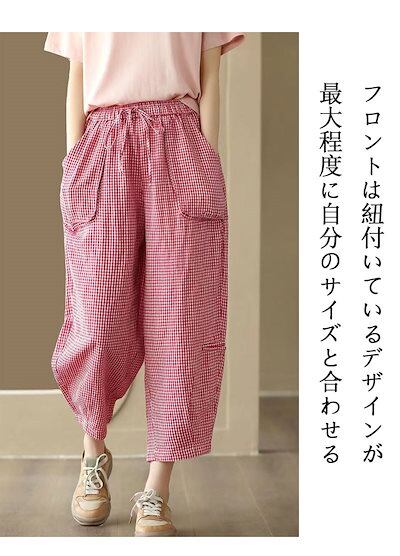 チェックパンツ レディース サルエルパンツ 9分丈 チェック柄 パンツ ウエストゴム ハイウエスト ポケット リボン 綿麻 イージーパンツ チェック 体型カバー ボトムス 大きいサイズ ゆったり きれ