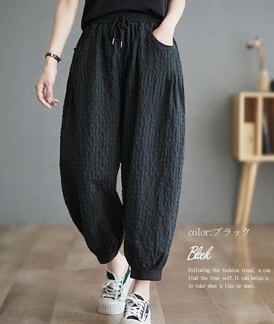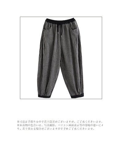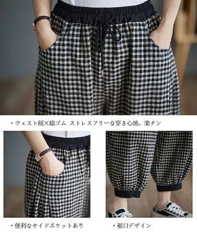 チェック パンツ 春夏 ゆったり チェックパンツ レディース ワイド コットンリネン バルーンパンツ ロング 総ゴム ギャザー 丸いシルエット 配色 サルエルパンツ 大きいサイズ ストレスフリー ポケ