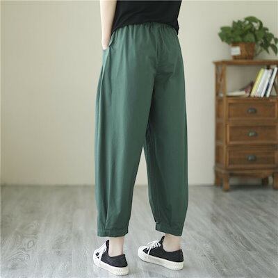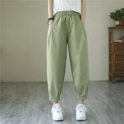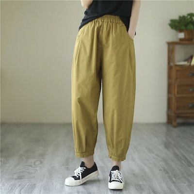 サルエルパンツ レディース 夏 春 秋 テーパードパンツ ロング丈 無地 綿 タック ロングパンツ ポケット付き パンツ 9分丈 ウエストゴム ハイウエスト ボトムス ゆったり バルーンパンツ カジュ