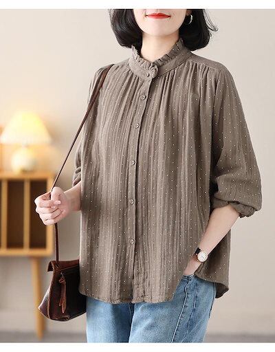 ブラウス レディース おしゃれ シャツ 長袖 立ち襟 シャツブラウス ドット柄 トップス ゆる 綿 コットンシャツ ふんわり 柔らかい 長袖シャツ バルーンスリーブ フリル 襟 水玉 前開き ボタン止